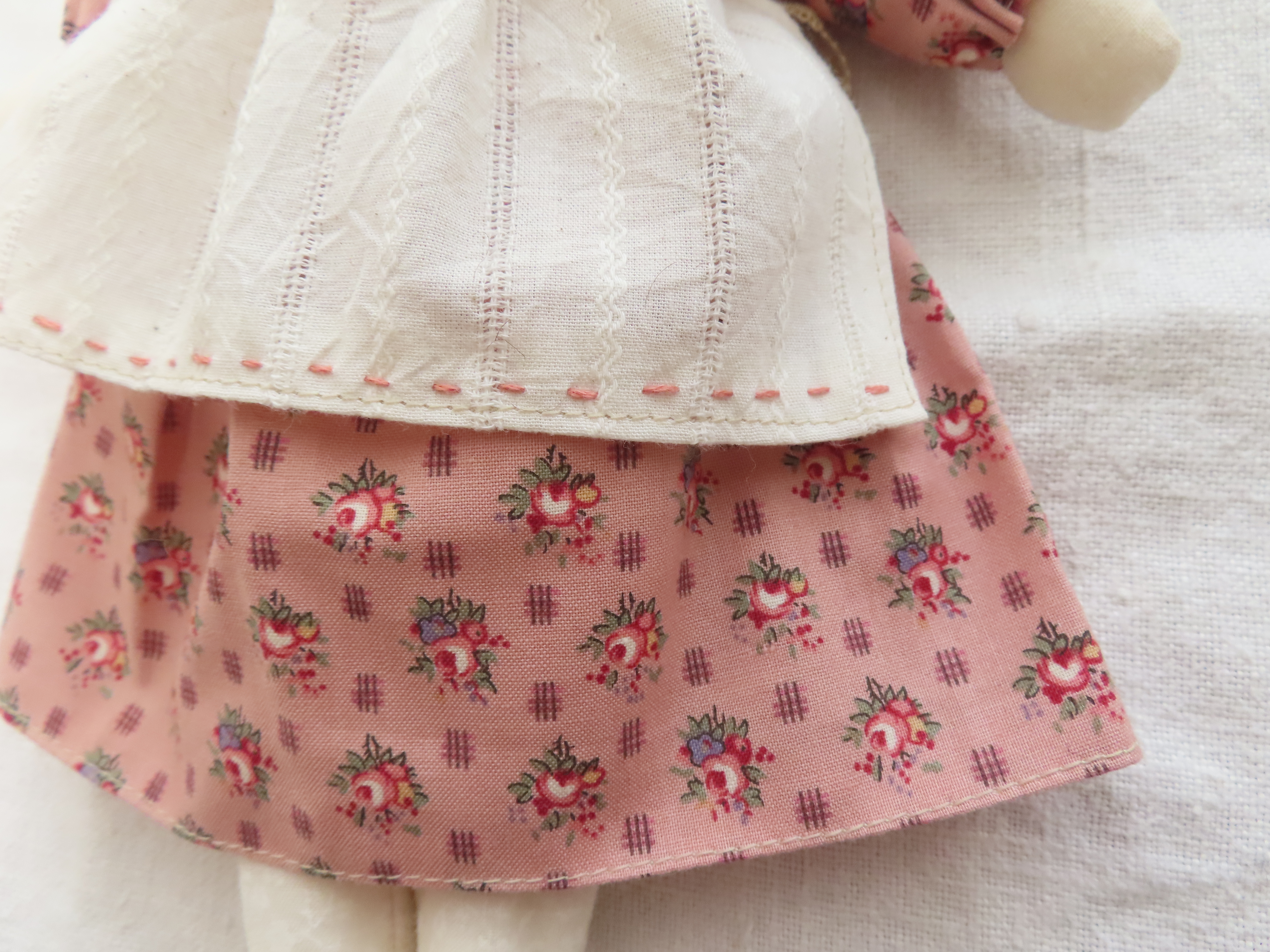 お洋服と手足は布で作り、腕と足には綿(わた)を入れております。