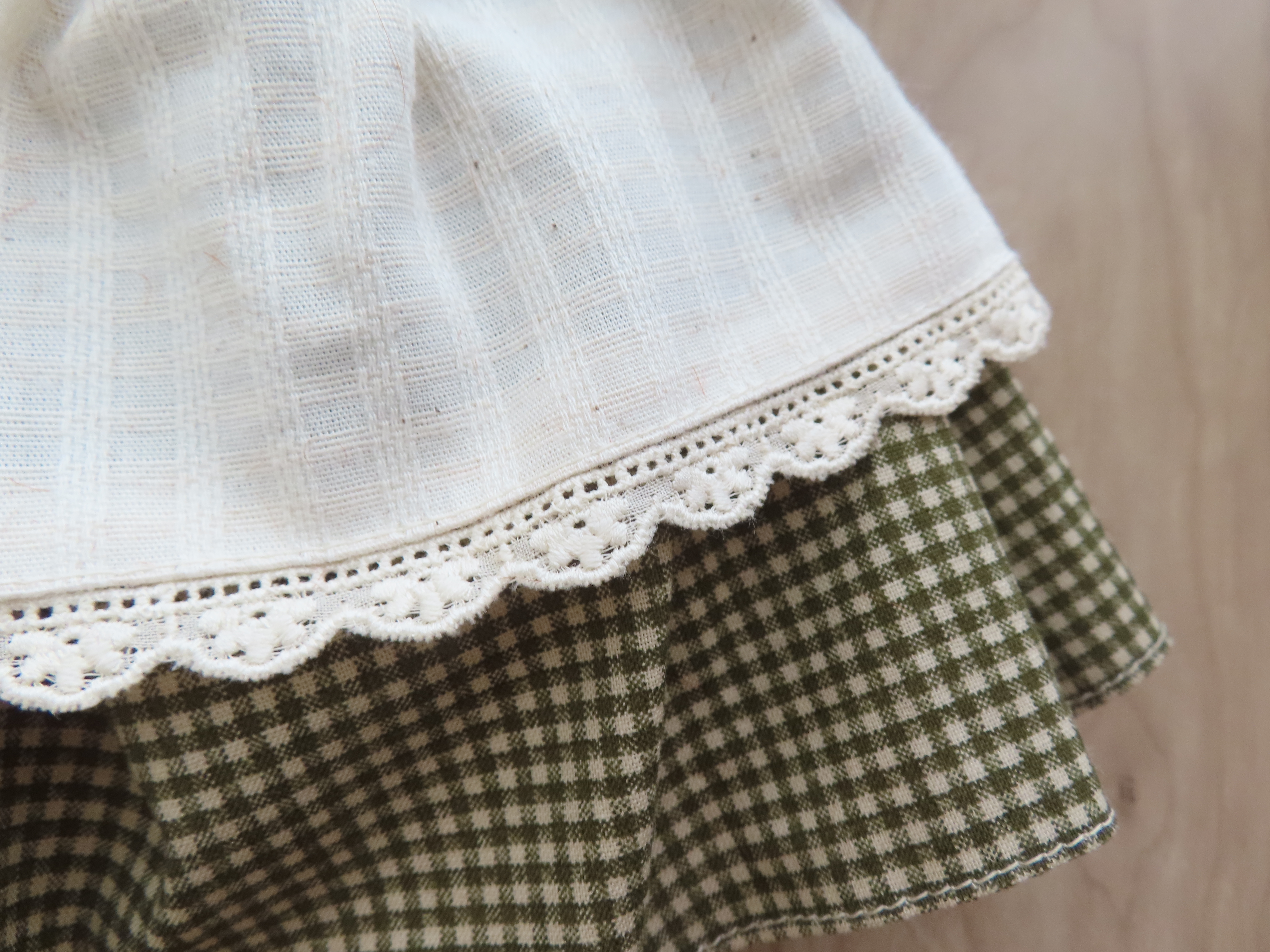 アンは緑のチェックのワンピース、ダイアナは花柄のワンピースを着て、ふたりとも、かわいいエプロンをつけています。