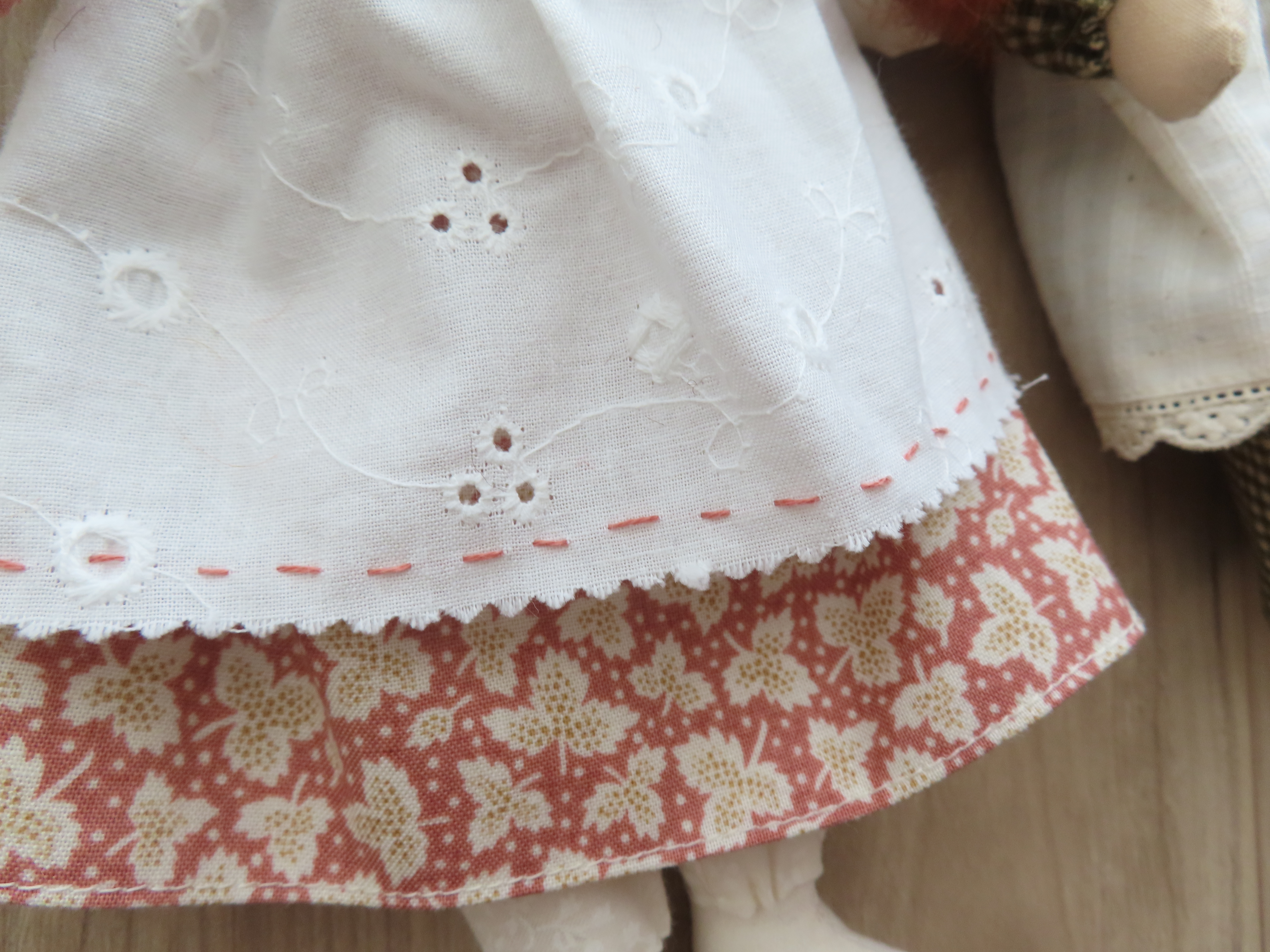 お洋服と手足は布で作り、腕と足には綿(わた)を入れております。